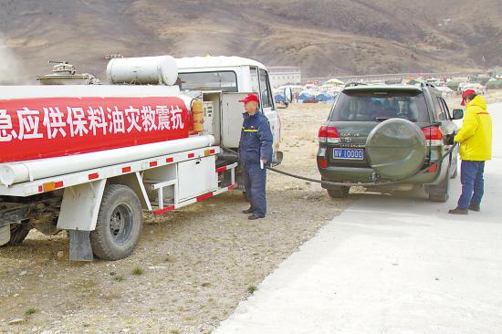 图为四川销售甘孜分公司应急保供配送车在震中为甘孜州州委应急救灾车辆加油。