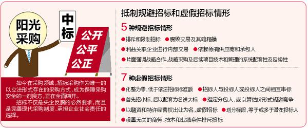 为此,总部物装部提出,要坚决抵制5种规避招标和7种虚假招标的行为,必须严格按照国家招标法的规定,依法规范开展招标工作。(记者任卓