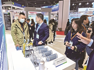 该展台上还展出了4000标准立方米/时的海水直接耦合制氢系统模型。通过该模型的演示,记者可清楚地看到海水实现直接制氢的过程。在实际使用中,该装置占地面积大幅减少。工作人员介绍说:“装置中的水处理系统无需额外耗电,仅靠装置本身的余热驱动。此外,装置还可应用于污水制氢场景。”