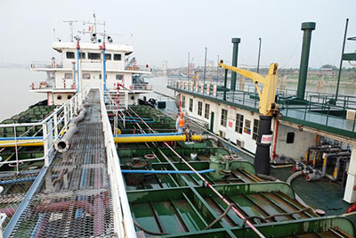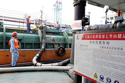 图为七里山储运车间码头班当班员工在巡检一船1900吨原料纯苯接卸情况