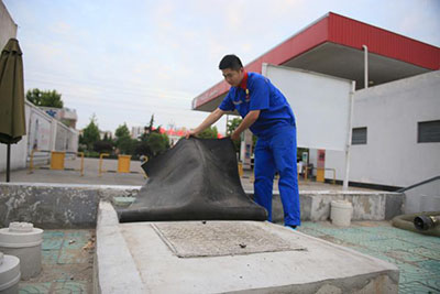 加油站油气回收处置罐上覆盖橡胶垫防止油气外溢