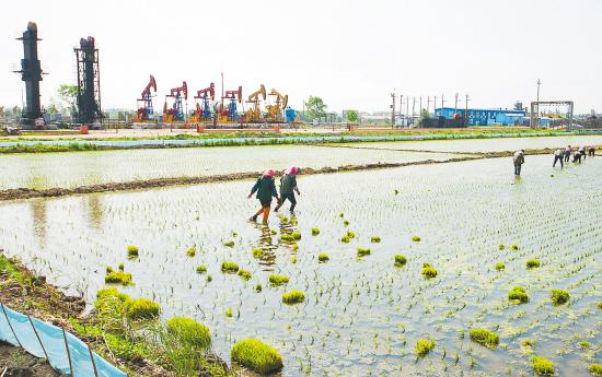 图为5月31日,采油303中心站油井作业与农民插秧和谐共存。