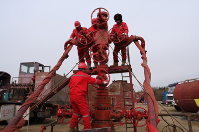 图为员工在压裂施工现场对设备井口的阀门进行维护,降低维修成本。