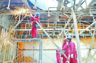 图为4月19日,中原油建工程公司施工人员在塔内部割除布水管线。
