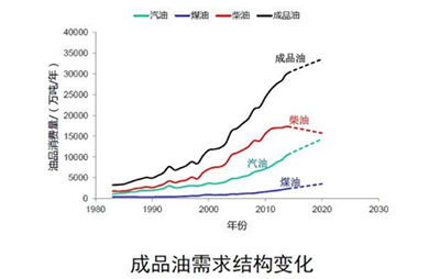 我国炼油产能目前已达到7.5亿吨。2014年,我国加工原油5.03亿吨,生产汽煤柴三大类成品油分别为1.1亿吨、0.3亿吨、1.76亿吨,平均开工负荷仅67.1%。与此同时,产品结构近年来有较大变化,成品油总需求量还在增长,但增长速度在下降,而且是汽油和航空煤油的需求在增长,柴油早已过了峰值。当前一个重要任务,就是不断降低柴汽比。