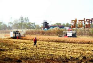 图为11月1日,采油三区302中心站油井旁,农民正在收割。