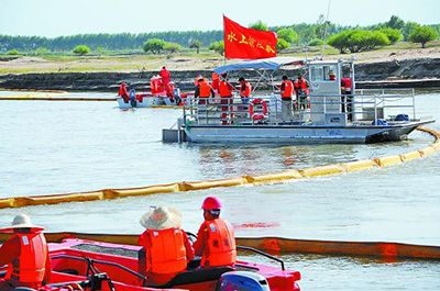 6月15日至16日,松花江上,碧水蓝天,骄阳似火,一只只快艇、收油船列队巡逻游弋,围油栏如黄龙横亘江面,将水上溢油成功拦截。吉林油田公司防汛应急物资设备操作培训阶段性考评和水上突发事件应急演练在松花江展开。吉林油田在松花江、嫩江行洪区内有大量油水井和管线分布,存在溢油风险。这个公司2012年在新民采油厂建设了应急物资库,陆续配备自航收油机、围油栏、吸油棉等物资装备,2015年10月成立“吉林油田水上应急中心”,每年组织开展训练和演练,有效降低环保风险。