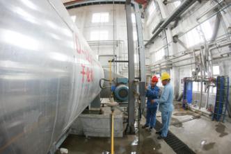 图为水务部水净化一车间职工在对污泥干化装置进行巡检。
