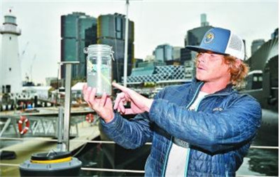 图为Seabin项目首席执行官皮特·塞格林斯基在悉尼展示Seabin收集到的塑料碎片。