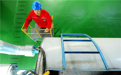 图为:华东石油局泰州采油厂帅垛井组职工在检查天然气分离器。
