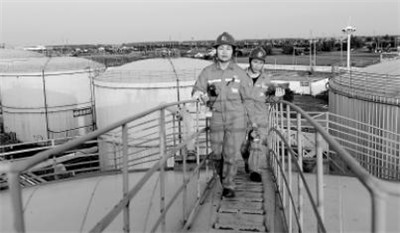 近日,华东石油局泰州采油厂洲城联合站储油罐罐顶气和油船气回收装置投入使用。该装置通过密闭抽气装置集中回收挥发气并给锅炉提供燃料,年可回收气体近50万立方米,有效节约了供热设备所需自用燃料。图为洲城联合站员工在对储油罐顶气回收装置的设备进行维护保养。