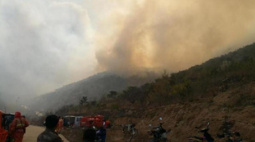 4月20日,烟台蓬莱市村里集镇附近山上着火,浓烟滚滚,燃烧迅猛,所燃烧灰尘受8级大风影响,在空中四处飘散,山火迅速蔓延,沿风向很快向所连接山峰燃烧。