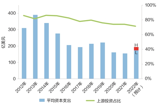 2022年,随着国际大石油公司投资总额的增长,预计上游投资同比增幅约8%,仍保持占总投资70%左右的水平。对当前高油价未来走势的高度不确定性,是各公司仍然保持谨慎投资的主要原因。虽然上游投资的增速放缓,但各大石油公司均制定了持续降低生产成本和战略资产归核化的方案和实施路径,以进一步提升投资效率。