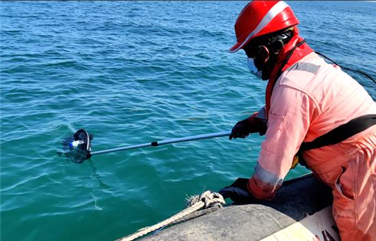 在海上施工中,252-253联队为了最大限度保障鲸类、儒艮、海豚、海龟等大型海生物不受海上物探作业影响,在每条震源船上都配备了至少两名海洋哺乳动物观察员,一旦发现情况立即报告,再由气爆作业人员根据海洋动物观察和软启动标准逐渐升高气压,确保哺乳动物远离后再作业。同时,在所有小型工作艇上加装螺旋桨护罩并严格限速,有效避免了海洋生物意外受伤害。