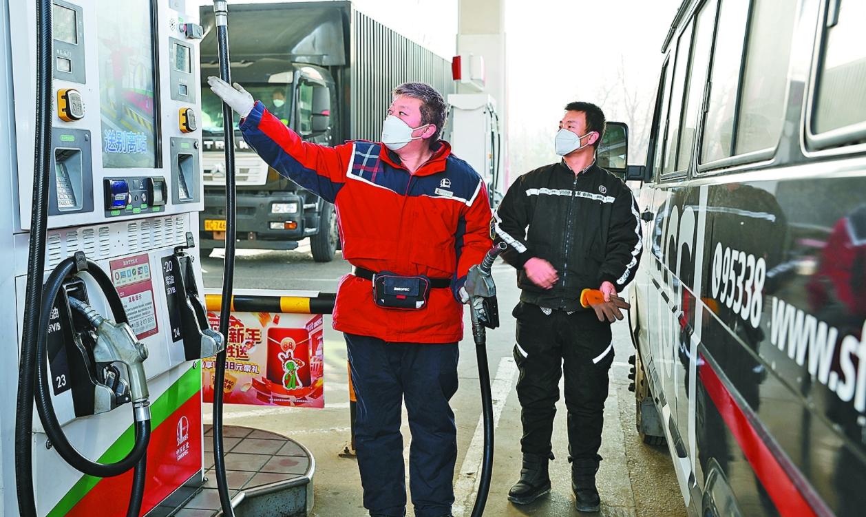疫情防控措施优化调整以来,北京加快复工复产步伐。北京石油为物流快递等企业客户开辟绿色通道,保障加油站油品高库存运转,全力为首都物流畅通加油。图为1月6日,顺金运加油站员工服务物流快递车顾客。