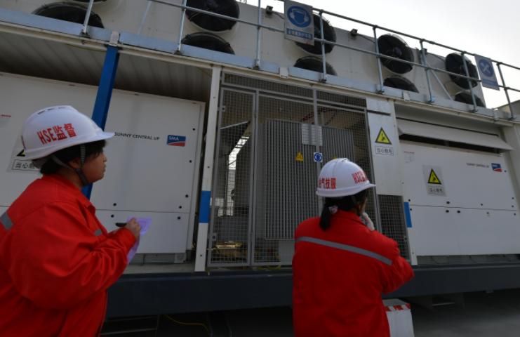 图为安全管理人员进行PEM制氢电源柜及空冷系统噪音测试。