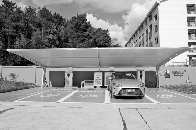 8月3日,湖南石油首座自建自营充电站“石化易电”在湖南衡阳石油双园加能站建成。他们在加能站空地开辟充电区,配备大型专用箱式变压器,设置两台一体式大功率直流充电桩,可同时为4辆电动汽车充电,实现加油加气充电业务一体化。图为该站“石化易电”区。刘芷杉摄