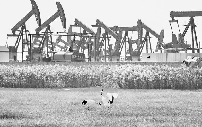 图为丹顶鹤在采油作业三区井场外的滩涂上驻足。