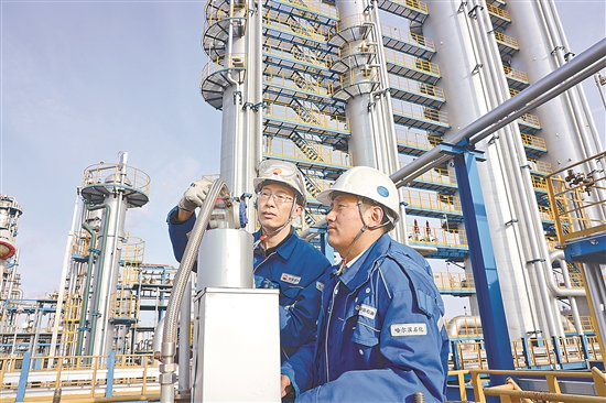图为仪表技术员唐旋(左)和班组员工贾洪双在对室外仪表设备进行检查。