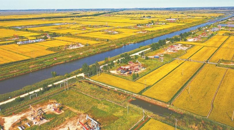 ←金海采油厂采油作业一区稻田与油井辉映成景。