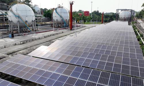 湖南石化着力调整用能结构,加快新能源发展,利用屋顶、地面等闲置空地建设分布式光伏发电项目。截至5月22日,光伏发电装机容量达2兆瓦,今年累计发电超48万千瓦时。图为八号沟储运装置光伏发电项目。