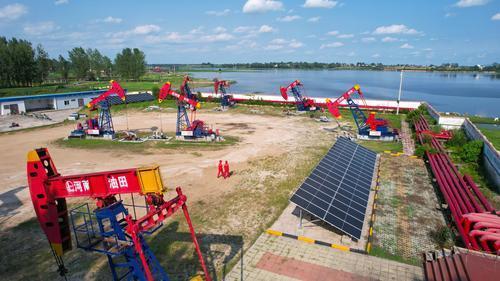 河南油田充分发挥油区日照充足、风能资源丰富优势,加快推进光伏、风能开发利用,助力绿色开发,截至7月底,累计建成投用新能源发电项目30个,发绿电9650万千瓦时。图为该油田古城8号计量站现场,光伏发电与原油生产融为一体。戚剑峰摄单朝玉文
