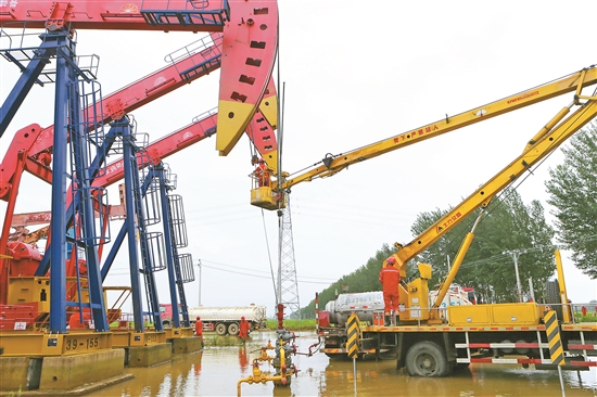 洪水退去,沈阳采油厂员工对抽油机进行校正,为复产做准备。靳莹 罗前彬 摄影报道