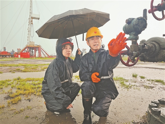 图为冀东油田员工张瑞萍(左)和张中华正冒着大雨对油井进行巡检。(杨军 周利 摄影报道)