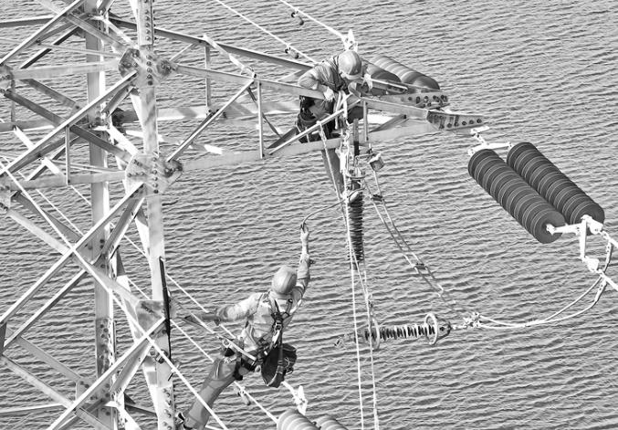 图为员工高原(下)和赵伟佳(上)在冀东油田南海124线塔上进行电力检修。