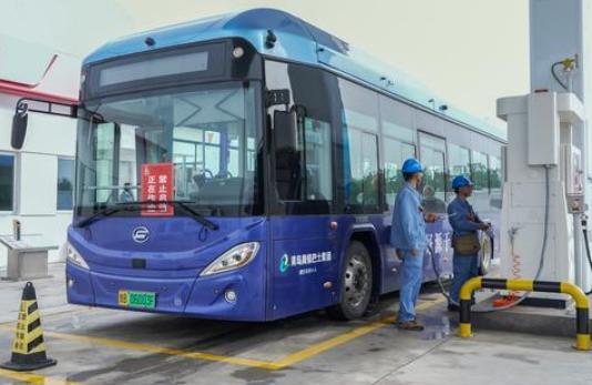 10月22日,随着首辆氢能公交车完成加氢,青岛首座具有商业运营资质的加氢站——海河路加氢站,在青岛炼化氢能“产研加”示范园内正式运营,该站可为社会氢能车辆提供加能服务,实现青岛商业加氢站“零”的突破。图为青岛炼化工作人员为氢能公交车加注氢气。