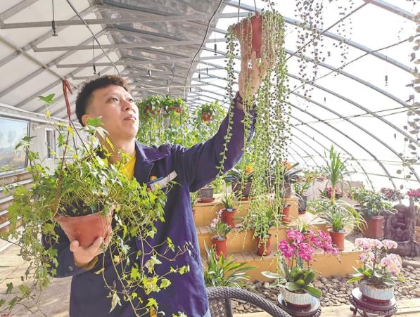 大庆油田员工王钊对耐寒宿根花卉进行细致观察。
