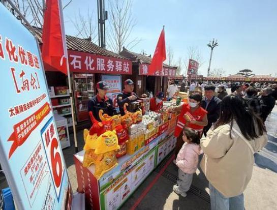 每年农历二月初二,河南周口淮阳太昊陵庙会举行,持续一个月。河南周口石油借庙会契机,创新推出“油品优惠+文化消费+全域服务”新模式,实现文化传承与拓市扩销双赢。该公司在庙会核心站点开通加油绿色通道,在非遗市集设置服务驿站,在高速服务区站发放逛庙会指南,构建文旅消费生态圈。3月以来,周口石油淮阳公司服务游客超50万人次,汽油销量同比增长16%。图为3月18日员工在太昊陵庙会入口处设立特色商品展台。