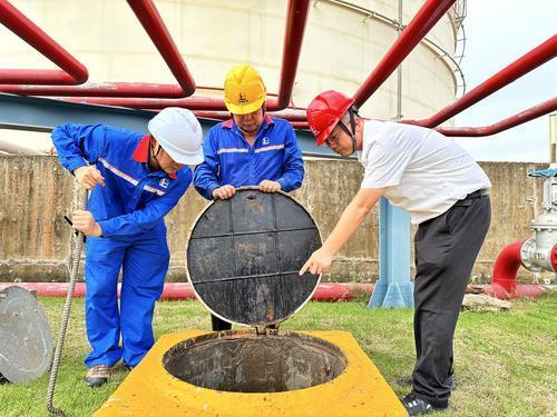 广西北海石油铁山港油库全面排查发油区、罐区及排水系统隐患,清淤疏通雨污沟,确保清污分流系统高效运转,筑牢汛期安全防线。图为员工检查罐区排水系统。骆宗萍摄