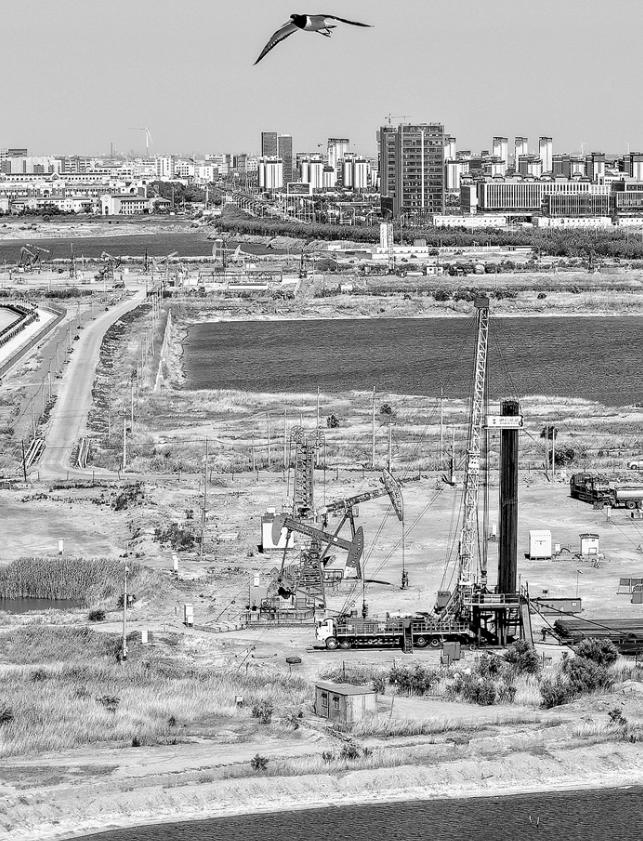 海喜鹊飞过高103平台生产现场,呈现出人与自然和谐共生的画面。