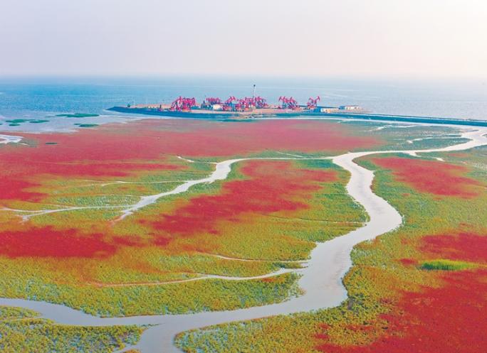 6月17日,辽河油田金海采油厂滩海油区内,抽油机上下摆动,不远处滩涂上碱蓬草渐染红晕。