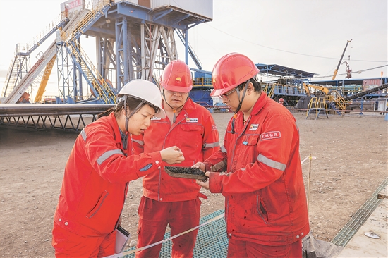 新疆油田公司吉庆油田作业区技术人员现场查看钻井岩屑。吕殿杰 摄
