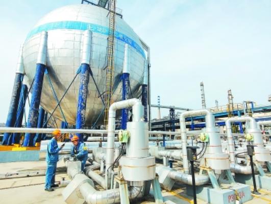 图为10月22日齐鲁石化员工在液态二氧化碳罐区巡检。
