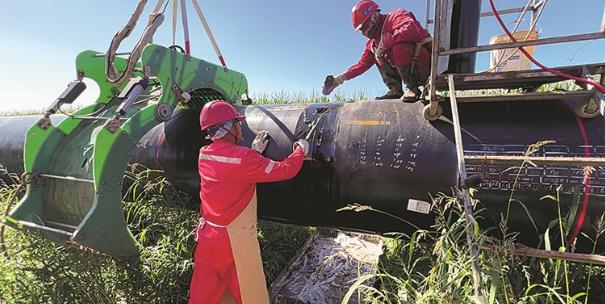 中国石油加强固体废物全过程合规管理,防范土壤和地下水污染,持续开展生态环境隐患治理。在工程建设过程中,管道局强化土壤污染物环境风险管控,以最大程度减少污染。图为员工正在进行防腐作业。