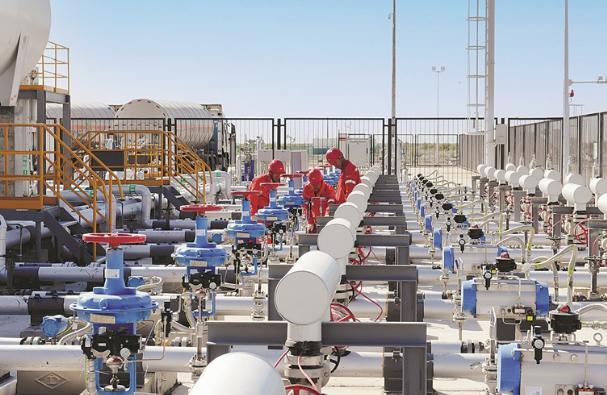 中国石油加大温室气体排放控制力度,牵头组建CCUS中央企业创新联合体,在松辽、准噶尔、鄂尔多斯等盆地建设CCUS产业中心和示范项目。图为新疆油田八区530井区二氧化碳混相驱先导试验站员工正在对二氧化碳注入点进行检查。