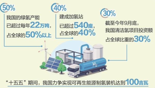 当前我国氢能产业快速发展,多项技术指标居于全球首位。目前,我国的绿氢年产能已超过22万吨,占全球的50%以上;建成的加氢站已超过540座,占全球的40%。数据显示,截至今年9月底,我国清洁氢项目投资额占全球比重的30%,居全球首位。