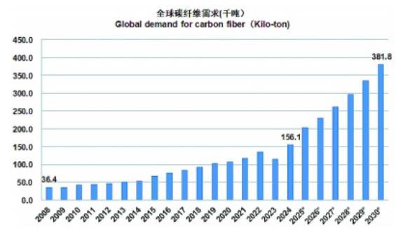 2024年,国内碳纤维产能达13.55万吨/年,年需求量9.86万吨。上海石化、吉林化纤、中复神鹰等行业龙头企业产能利用率均超过90%,部分规格产品甚至出现供不应求的情况。随着风电叶片长度突破100米,对碳纤维需求日益迫切,大丝束碳纤维价格企稳回升,行业整体景气度持续向上。从2024年碳纤维消费结构来看,风电叶片需求量最大。