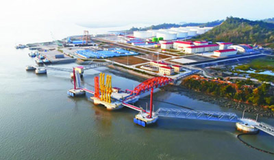 马德岛位于缅甸若开邦皎漂市东南部,岛上建设了30万吨级原油码头、工作船码头、65万立方米水库、38公里航道、120万立方米原油罐区等。(特约记者王延晖摄)