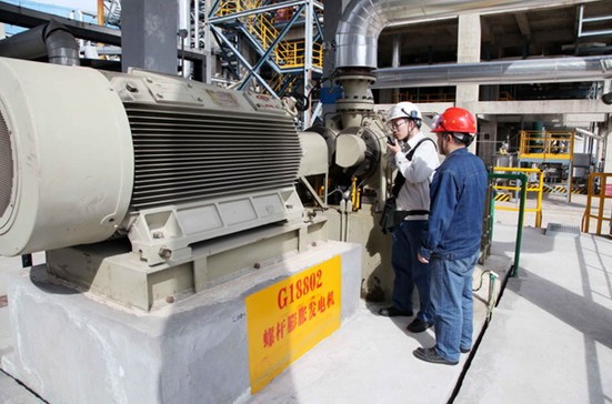 图为职工在认真检查蒸汽发电机运行情况。