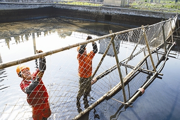 [中国石化新闻网2012-03-28]水葫芦能将富营养水质转化成可直接饮用水,被誉为污水净化的"生态功臣"。近日,安庆石化港贮部为解决污水处理过程中的水质富营养化难题,准备在污水处理场引种水葫芦。图为施工人员在污水池搭建隔离网,为种植水葫芦做准备。