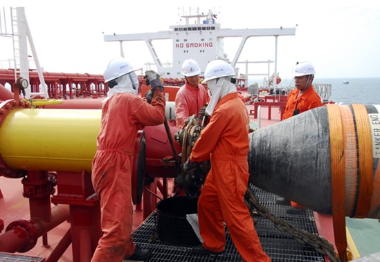茂名石化职工在接卸油轮作业。丁旭珍 摄