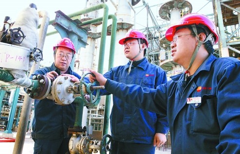 员工在苯乙烯装置前进行适时调整蒸汽量。廖和明摄