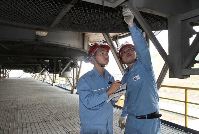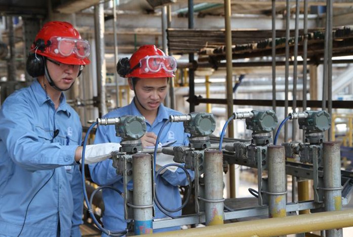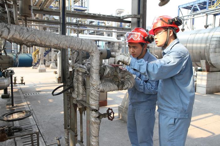 图为车间职工精心巡检观察记录回收冷凝液温度流量等各项指标