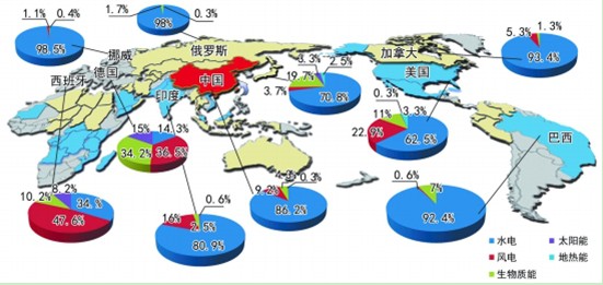 截至2011年年底,全球可再生能源发电排名前十位的国家分别是中国、美国、巴西、加拿大、俄罗斯、印度、德国、挪威、日本、西班牙。(数据来源:中国可再生能源行业协会官方网站)