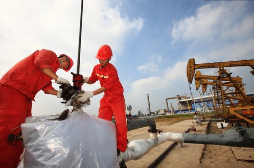 图为采油二区201中心站员工给油井套上防污膜。倪有权摄