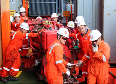 惠州19-2平台员工自主维修柴油消防泵。通讯员徐晓东摄